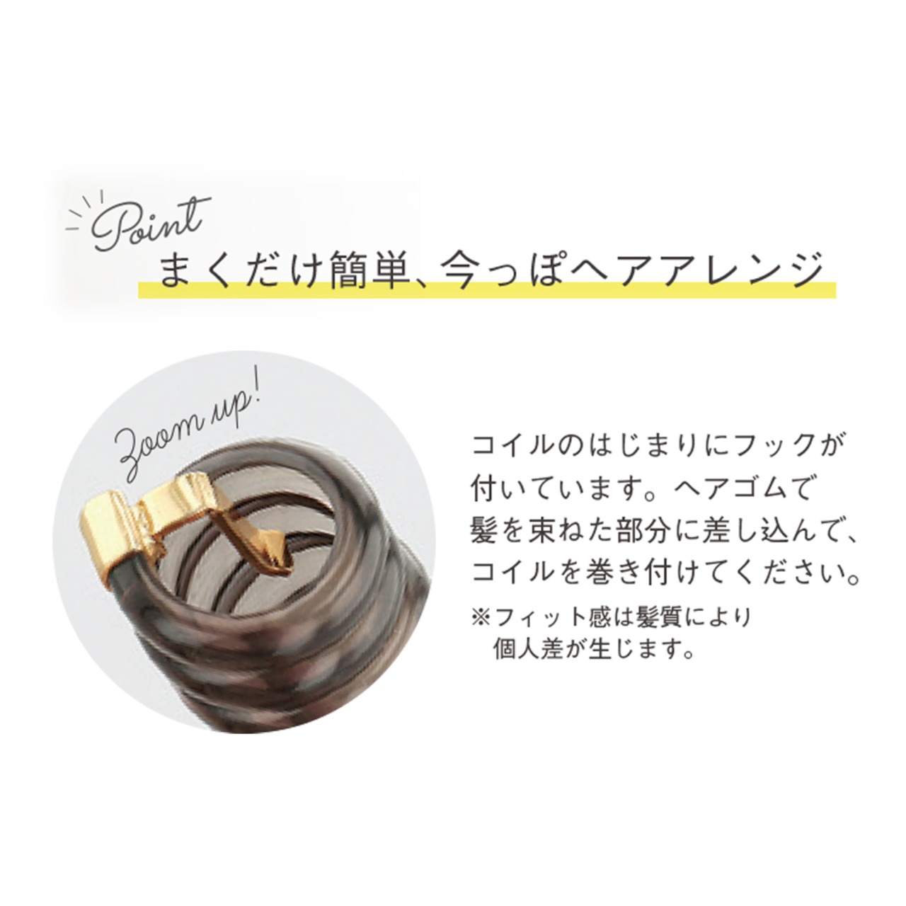 ヘアゴムで髪を束ねた部分に差し込んで、コイルを巻き付けてください。